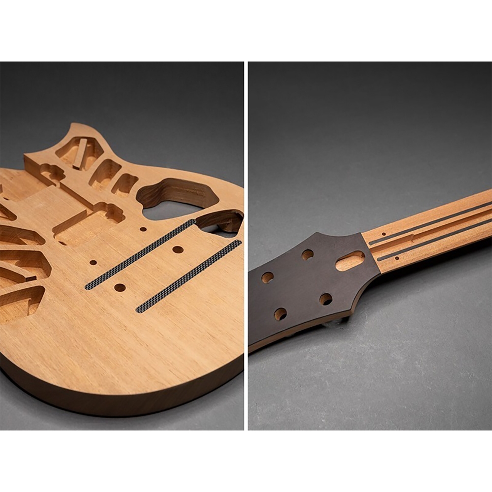 - Corpo: Mahogany (Mogno) com câmaras (Chambered) e tampo em Maple