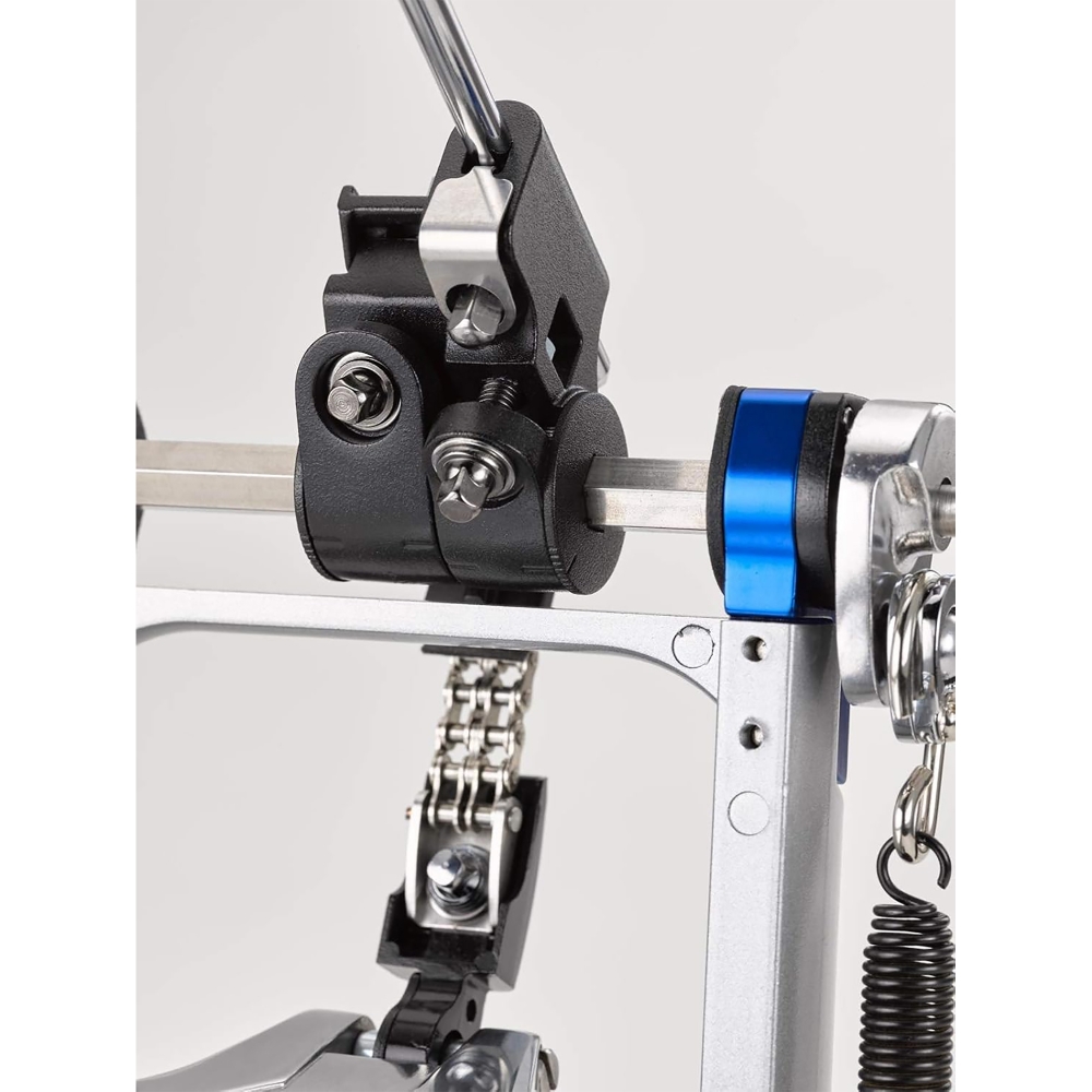 Pedal duplo de bumbo feito em aluminium e metal com acionamento por corrente dupla e ajustes de ângulos do batedor. Acompanha soft bag.