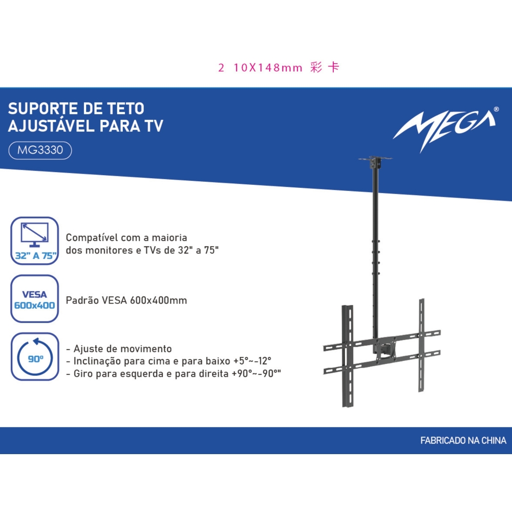 Eleve o nível do seu ambiente com o Suporte de Teto Ajustável Mega MG3330. Projetado para quem busca otimização total de espaço sem renunciar ao design, ele é a escolha definitiva para ambientes amplos e modernos.